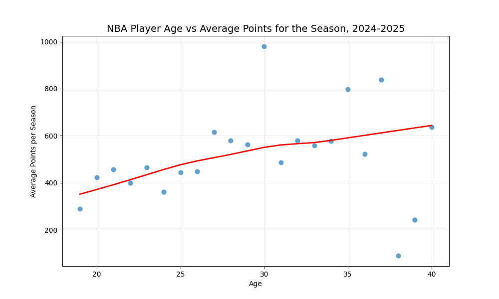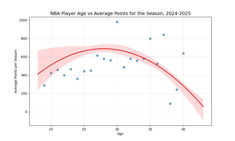 Let’s look at the average number of points scored by players during last season based on their age. The plot at the top of the page is fit with a LOESS model, and for simplicity, we can also fit a quadratic model: