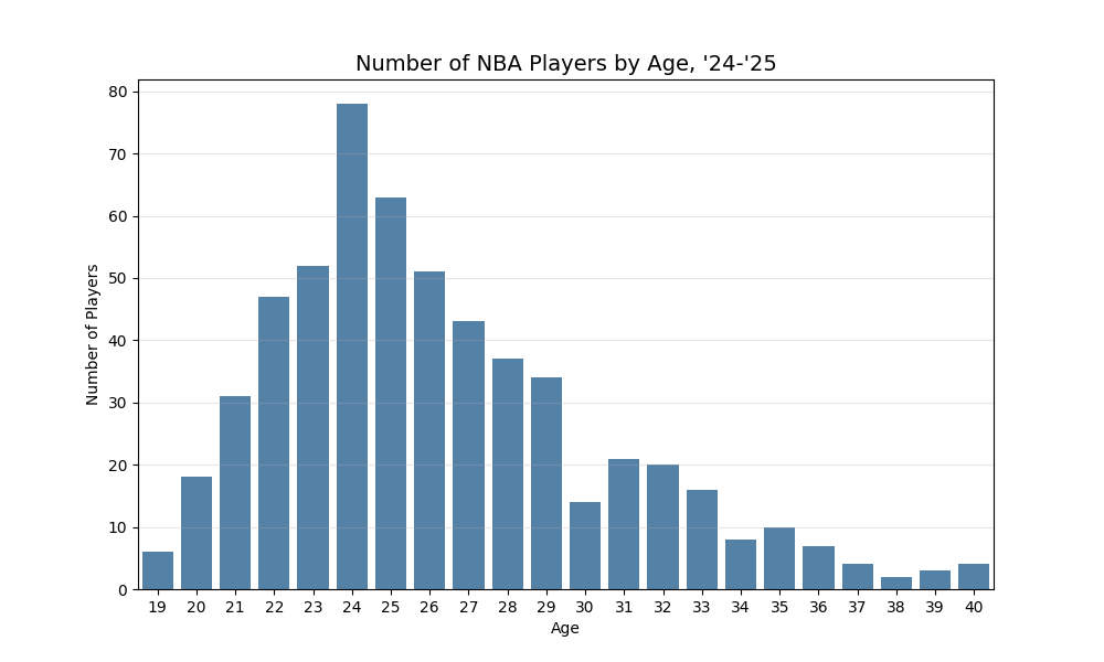 Without much context, these might be surprising. The LOESS model shows that players continue to score more points on average as they age, and the quadratic model shows a decline, but it shows players continuing to score at a respectable rate, even in their late 30s. This is contrary to what we might expect from older players being less athletic. Why don’t teams fill their rosters with older players who are great at scoring? The issue with that logic is that there’s a survivorship bias. The following table, bar chart, and explanation break it down for us.
