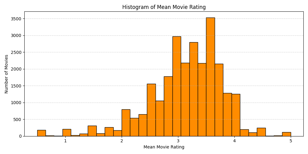# Plot histogramplt.figure(figsize=(10, 5))plt.hist(avg_ratings['avg_rating'], bins=30, color='darkorange', edgecolor='black')plt.xlabel('Mean Movie Rating')plt.ylabel('Number of Movies')plt.title('Histogram of Mean Movie Rating')plt.grid(axis='y', linestyle='--', alpha=0.6)plt.tight_layout()plt.show()